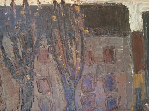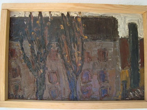 Maleri af Peder Brøndum Sørensen - Gadebillede med huse og træer 1966.