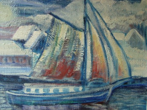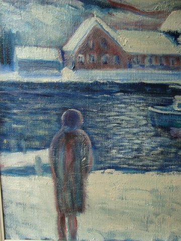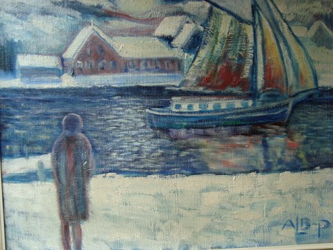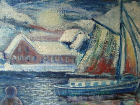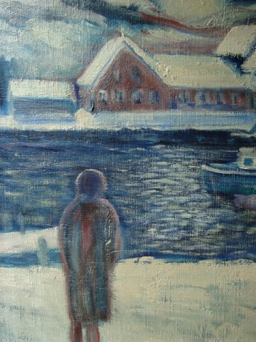 Maleri - Vinterparti fra havn med skibe og person.