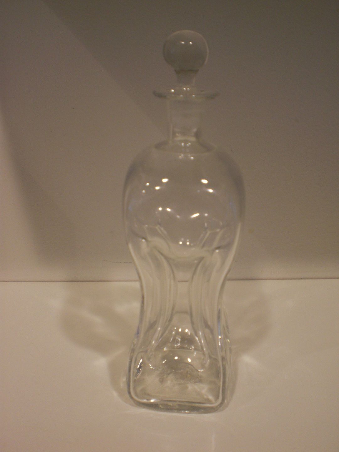 Klukflaske opdrevet og anhæftet og iboret for glasprop. Original massiv kugleprop. Kraven skævsleben. Højde m. prop: 25 cm. Formentlig Holmegaard ca. 1900.