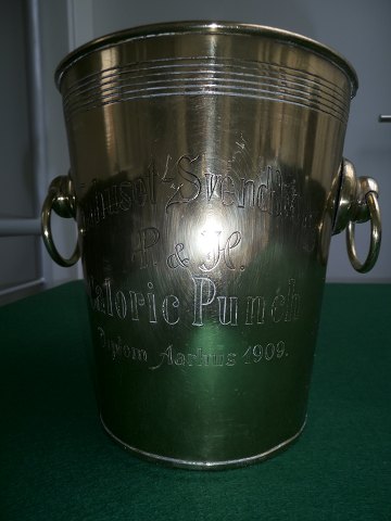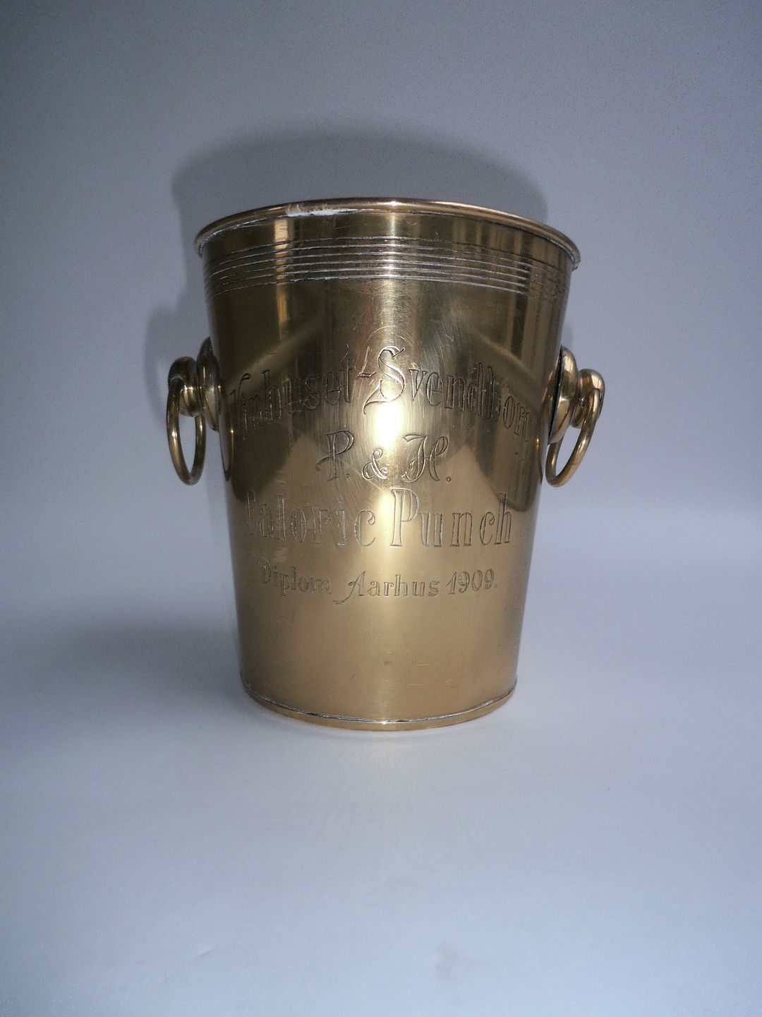 Vinkøler af Messing fra Vinhuset Svendborg, Danmark 1909. Følgende tekst er indgraveret på fronten af køleren; "Vinhuset Svendborg, P&H, Calorie Punch, Diplom Aarhus 1909"