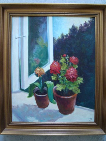 Maleri af Kai Pihl - Opstilling i vindueskarm med 2 potteplanter.