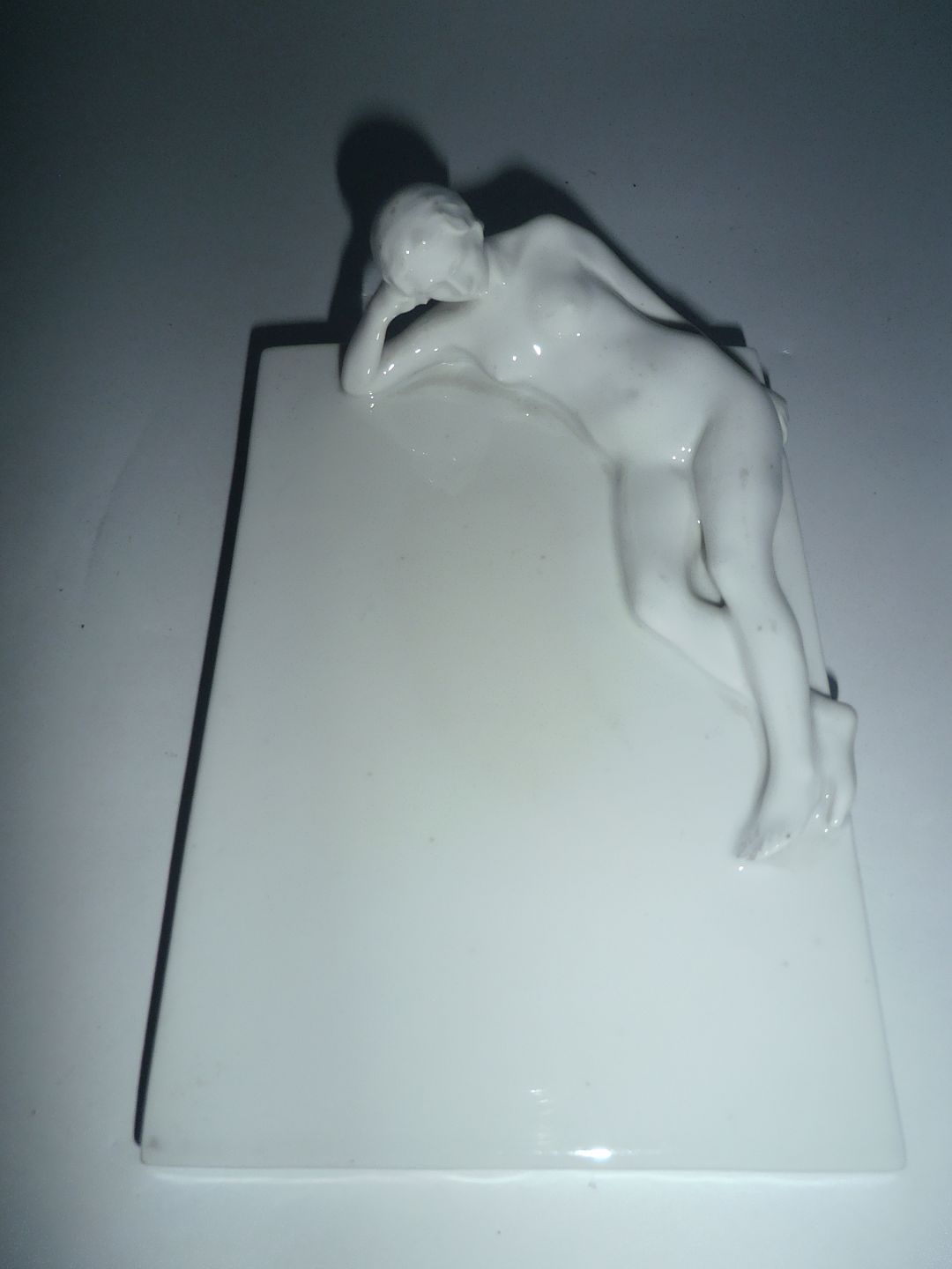 Hvid kvindefigur i porcelæn, liggende på plade fra Bing&Grøndahl, Danmark ca. 1920.