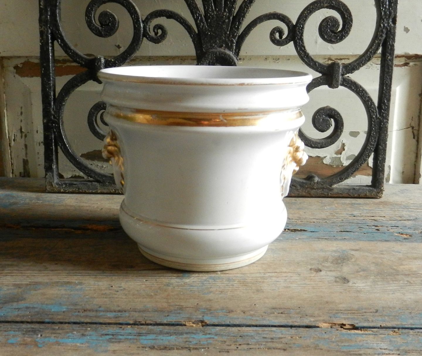 Fajance urtepotte med løve masker, dekoreret med guld.