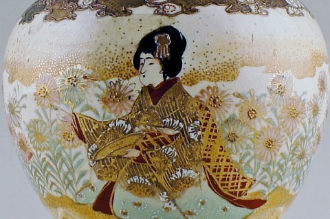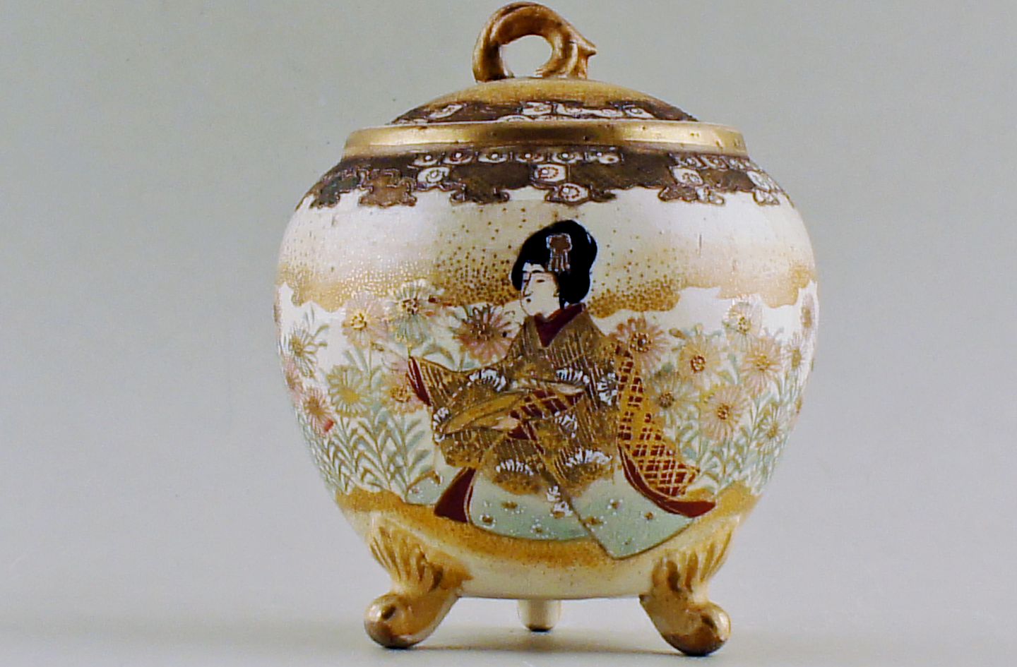 Satsuma fajance krukke med låg. Dekoreret med to kvinder i profil. Måler : 20 x 15 cm. Stemplet. Tidligt 20 årh.