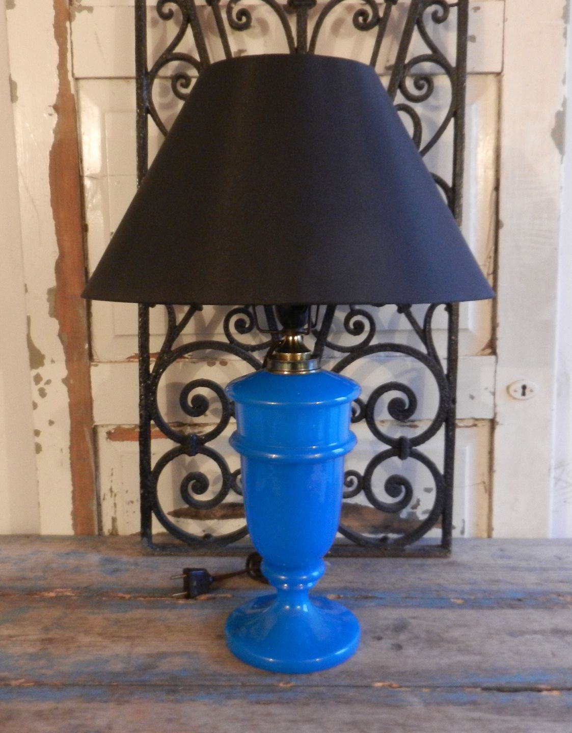 Meget smuk vaseformet bordlampe i blåt kraftigt opalineglas.