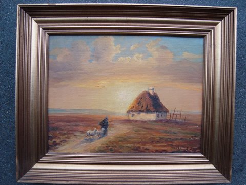 Maleri af Sergius Frost - Fårehyrde på vej mod hus på heden 1931.