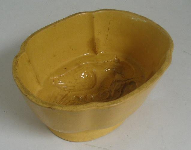 Pudding mould in glazed ceramics. Yellow, with conical sides, with bottom motif in the form of sitting parrot. 19th century. Bornholm, Denmark. L.: 22.5 cm. W.: 18 cm. H.: 10.5 cm.