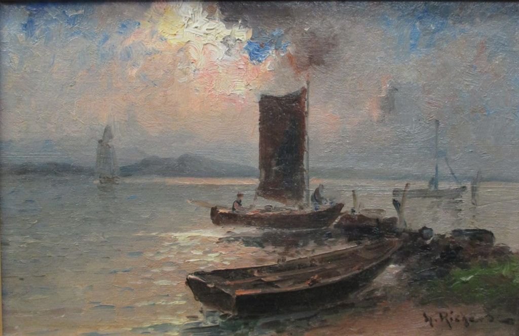 Richarde, Ludvig Otto (1862-1929): Marine with sailing ships - evening. Oil on cardboard. Sign .: L. Richarde. 16 x 23 cm.