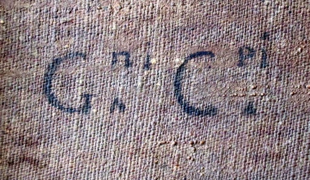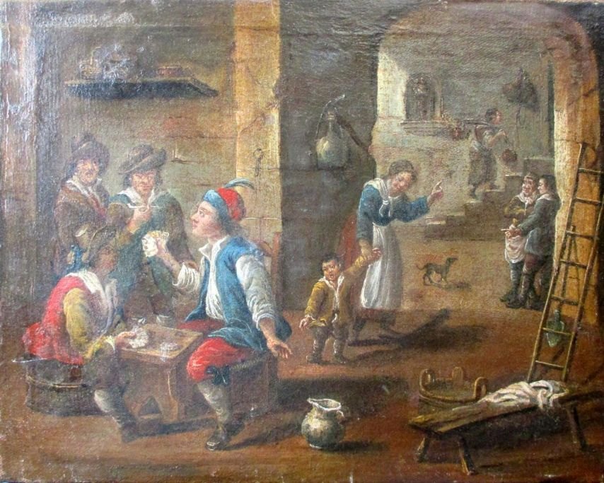 Dutch artist (18th century): Interior of a stone cellar with many people. Among others card-playing smoking men, and a strict mother etc. Oil on canvas. 36 x 46 cm. On the back of the canvas signed: G ..a.n.i. C .. pi. Repaired. Strecher from the 19th century. Without frame.