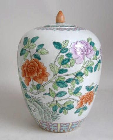 Kinesisk låg krukke, i porcelæn, 20. årh. Polykrom dekoration med fugle og blomster. Stemplet i bunden. H.: 33 cm.
