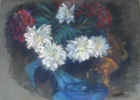 Dansk kunstner (19. årh.): Stor glasskål med blomster og samovar. Pastelkridt på papir. Usigneret. Antagelig Edvard Saltoft (1883-1939). Skåret ned.