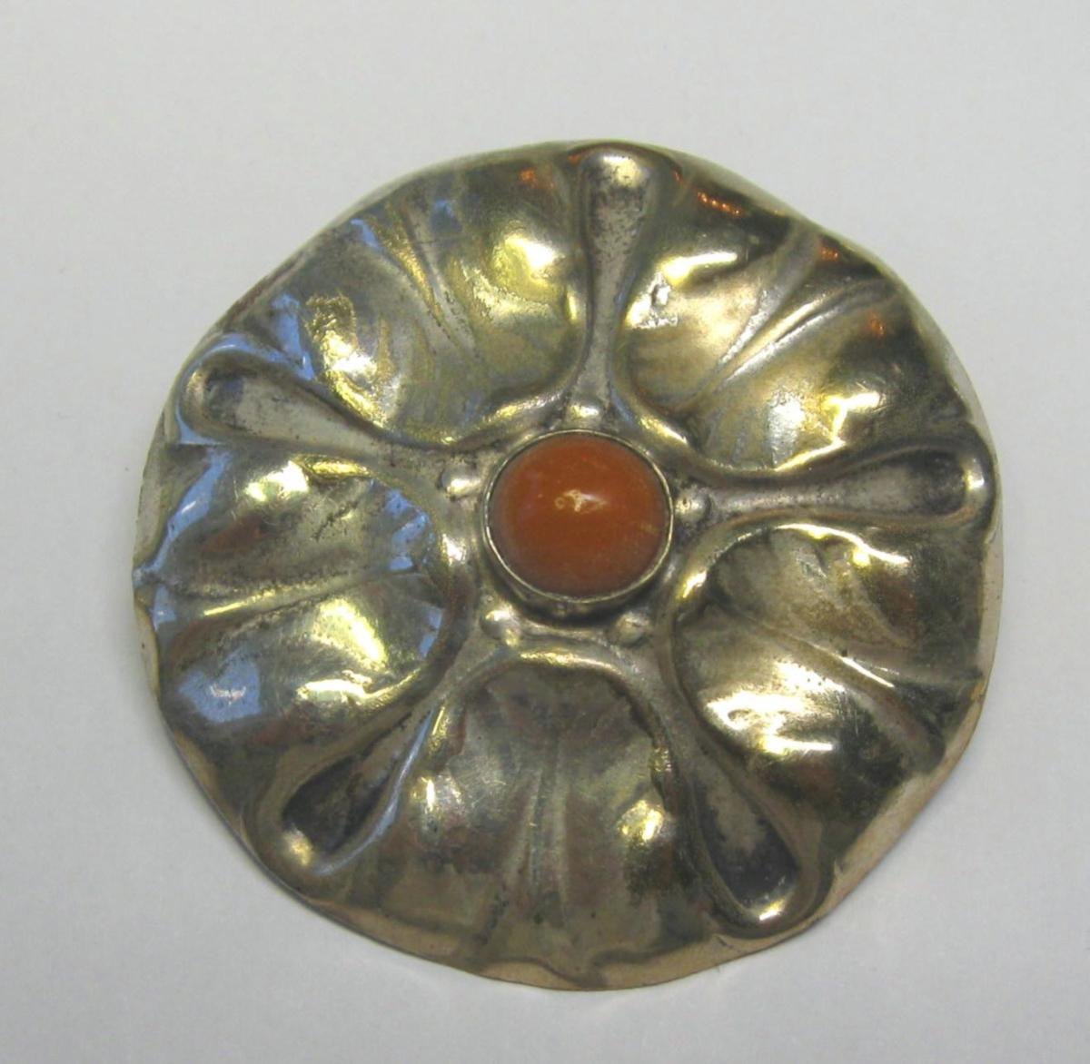 Art Nouveau Brooch in silver plated brass with amber. Denmark, c. 1900. Dia .: 5 cm.