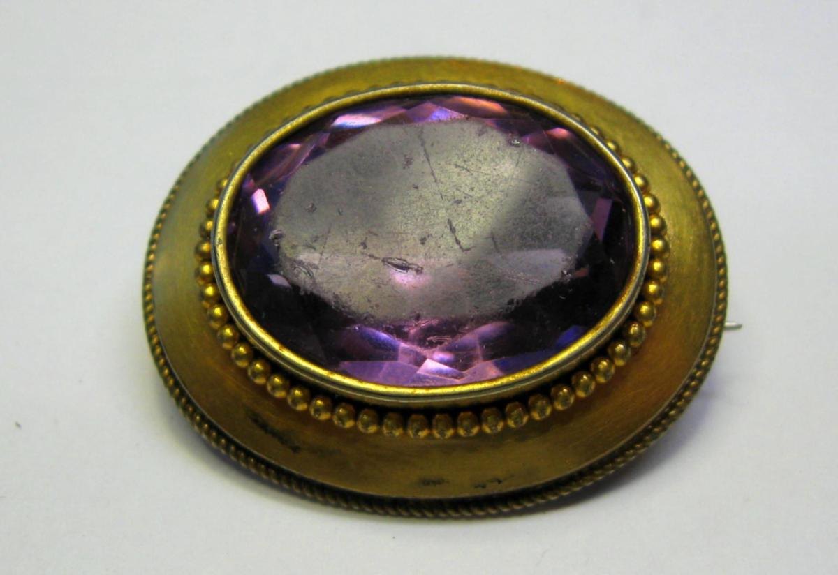 Brosche aus vergoldet Silber, u. 1900. Mit violetten geschliffen Schmucksteinen. Mit Anstecknadel. L: 3,5 cm.