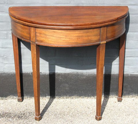 Demi lune spillebord i mahogni, Danmark, o. 1800, med tilspidsede ben. H.: 75 cm. Dia. plade: 90 cm.