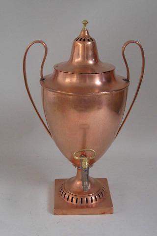 Themaskine i kobber, Danmark, o. 1800, empire. På firkantet fod, vaseformet krop med hanke. Låg med lågknop i messing. H.: 45 cm. flot stand.
