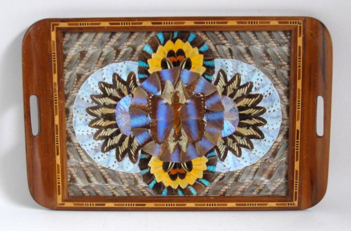 Bakke med med intarsia, ca.1920. Med glas og mønster med sommerfuglevinger. Sydamerika. Flot stand. 52 x 34 cm.