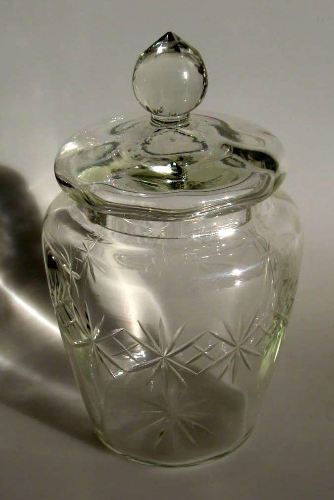 Kiksespand i klart glas med låg, o. 1900, Danmark. Med stjerne slibninger på korpus. Låg med sleben låg knop. H.: 20 cm.