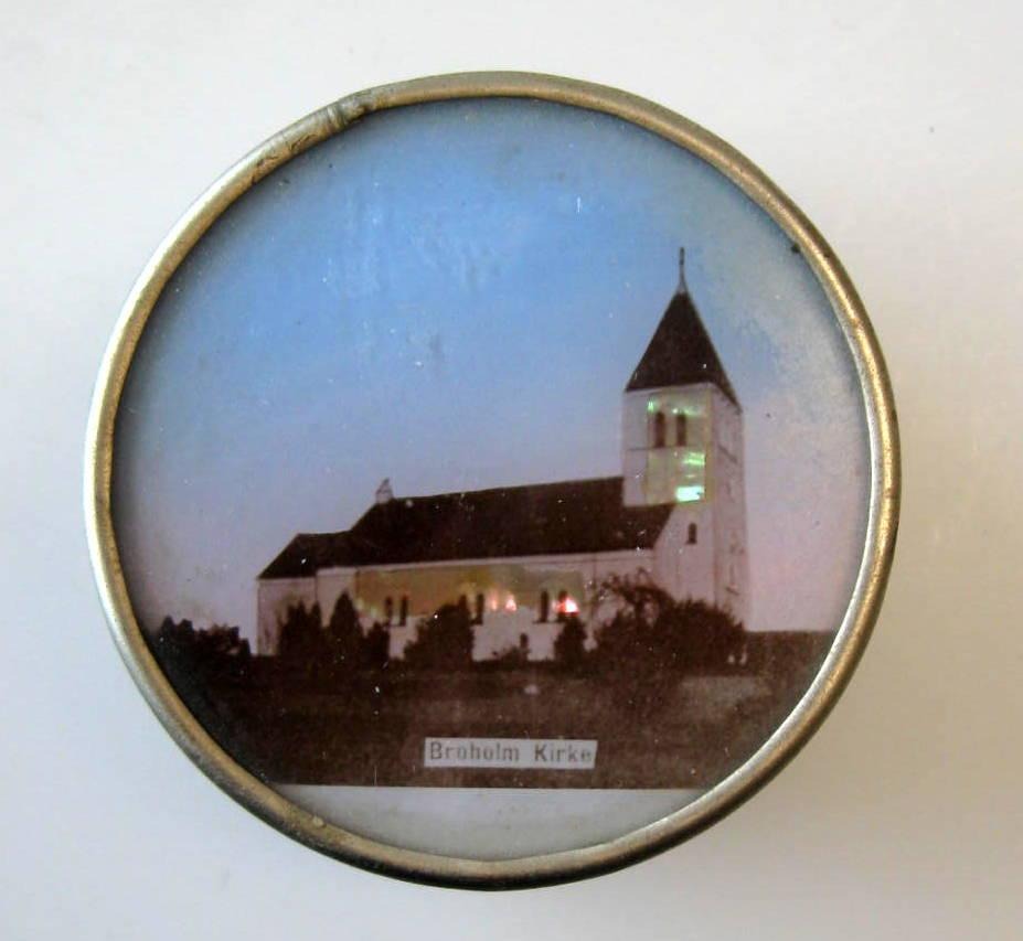 Lille metalæske med motiv af Broholm Kirke på Fyn. o. 1910.