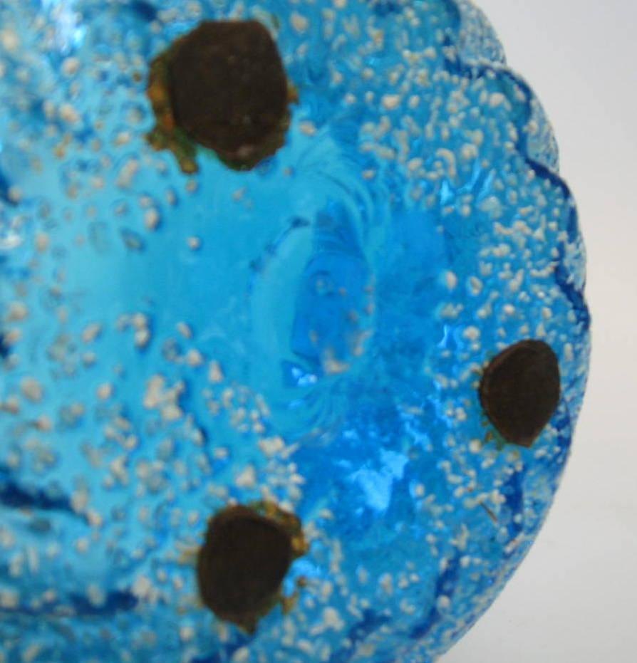 Glasskål med hank, i sø blåt glas, o. 1900 - antagelig Danmark. I det blå glas indlagtehvide prikker. Flæset kant og hank udformet som gren med knaster. H.: 16 cm. Dia.: 14,5 cm. Virkelig flot og sjælden!