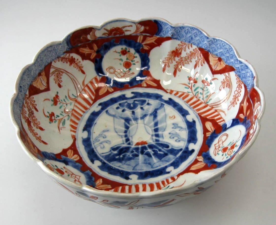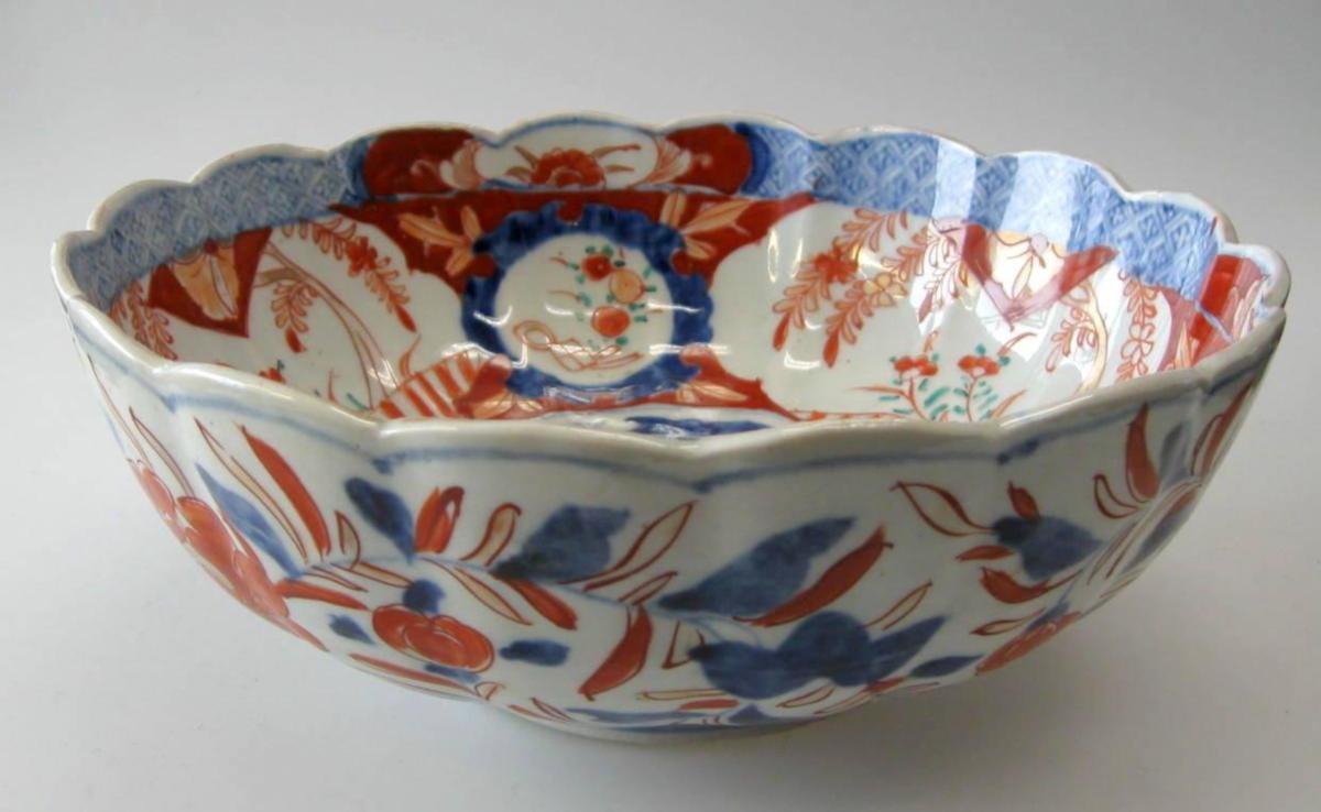 Japansk imari skål med flettet kant, 19. årh. Dekoreret i rødt, blåt og grønt. Dekorationer i form af blomster og planter. H.: 11 cm. Dia.: 25 cm. Usigneret.