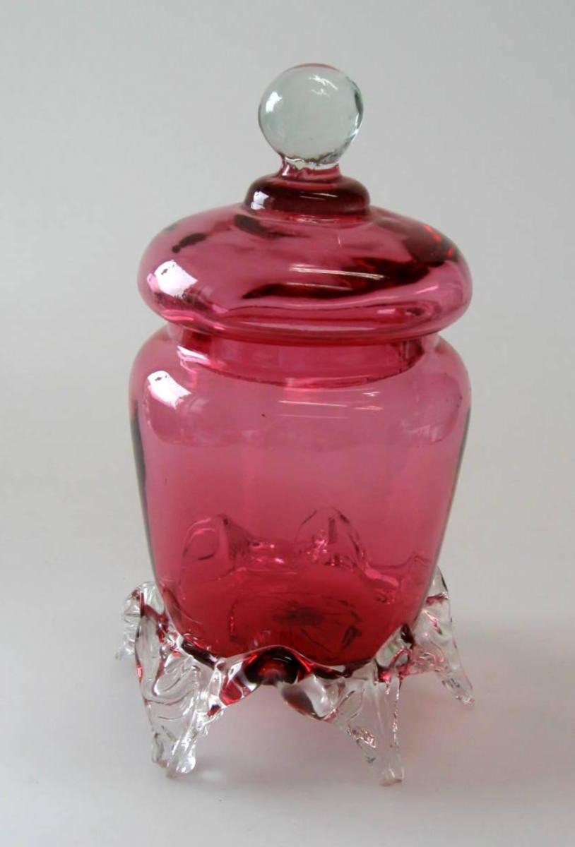 Lågkrukke i rubinfarvet glas, 20. årh. Odense Glasværk. Fødder og lågknop i klar glasmasse. H.: 17 cm. Afhæftet. Udformet som "glasfusk".