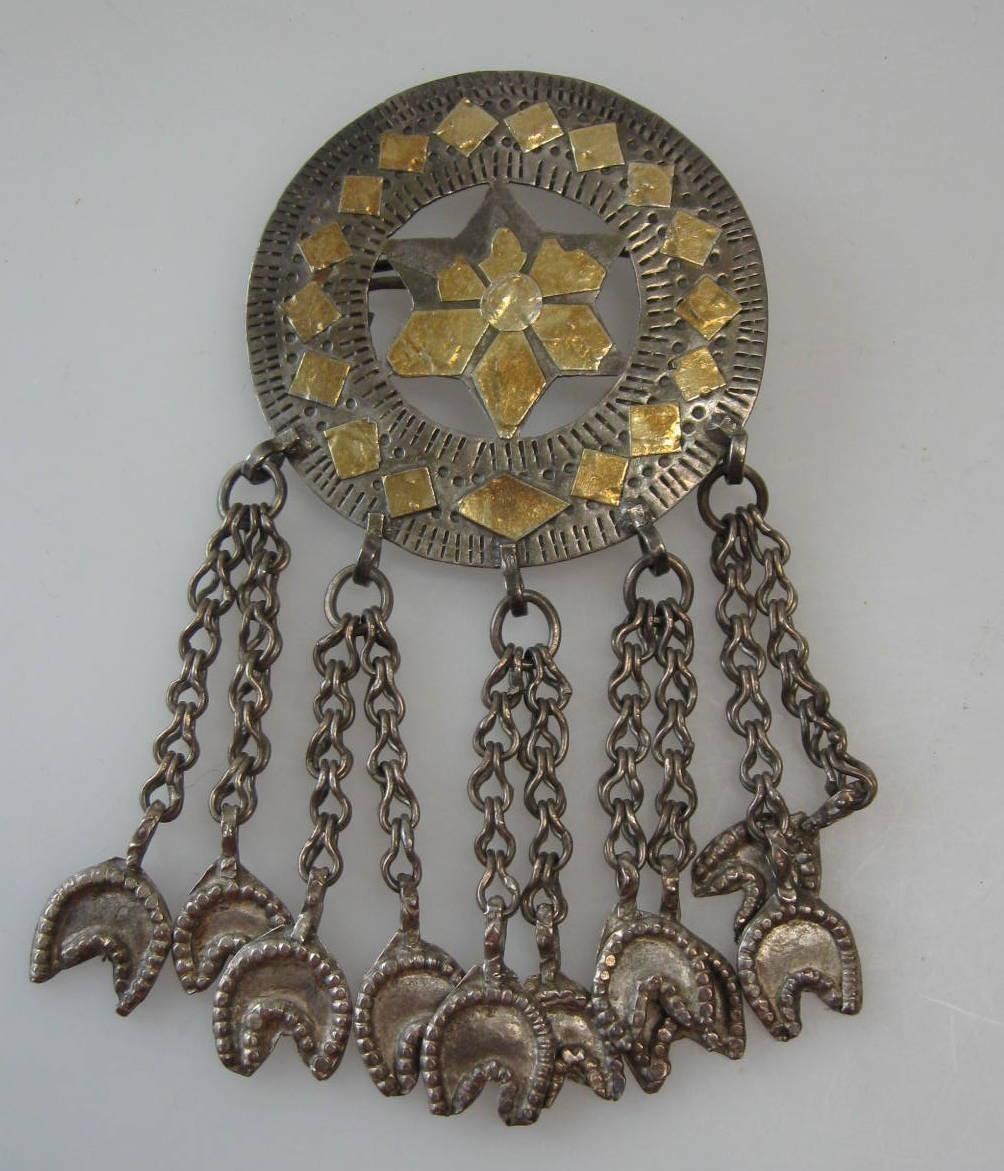 Antikt smykke i sølv og guld, Oman, 19. årh. Dekoration i form af cirkel med stjerne og hængende halvmåner. Dia. cirkel.: 5,3 cm. Vægt.: 43 gram.