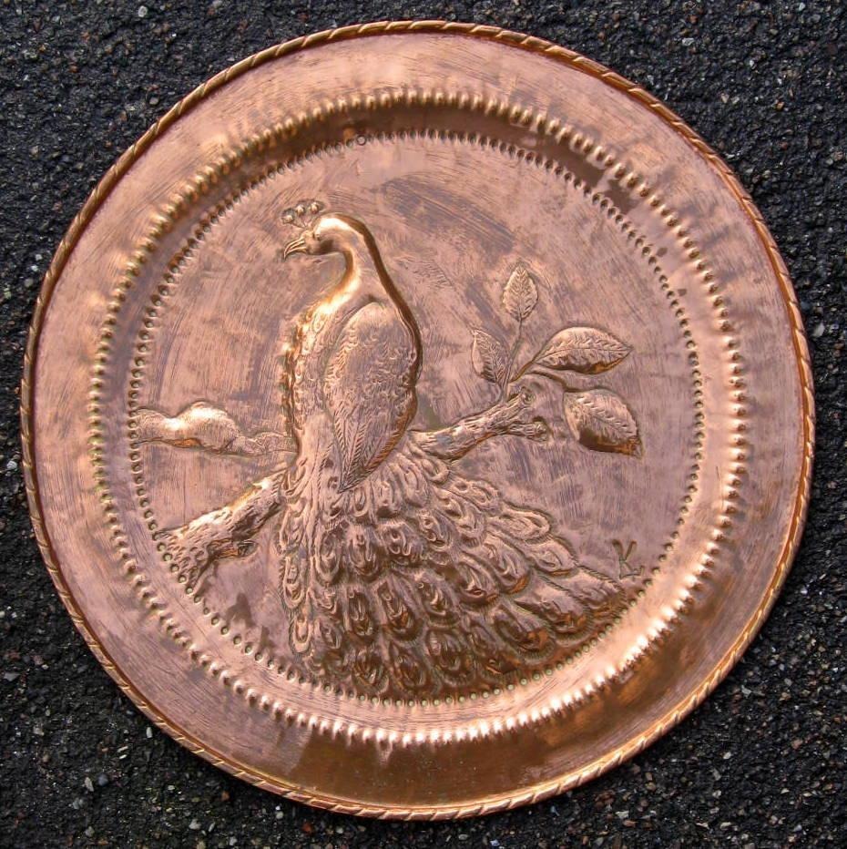 Copper plate with decoration of a peacock on a branch, 19th century. Denmark. Hammered. Signed .: KL. Dia .: 46.5 cm.