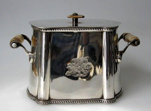 Engelsk forsølvet sukkerkumme, med låg med lågknop og hanke i ben. o. 1900. På siden monogram. H.: 11 cm. L.: 18 cm.