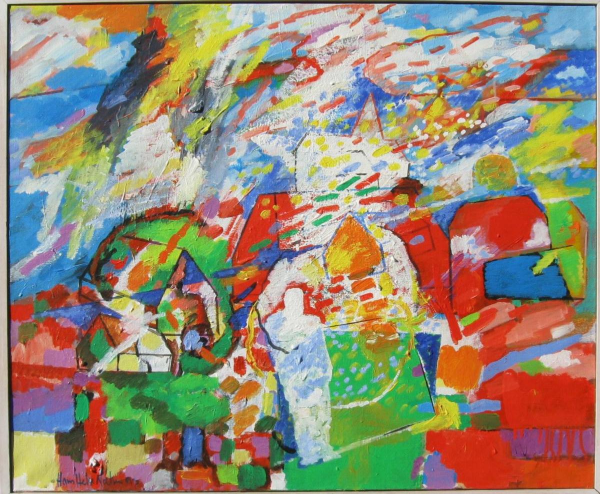 Nielsen, Hans Helge (1942-): The village. 70 x 85 cm. Oil on canvas. Monogrammet and signed on the back 1993.