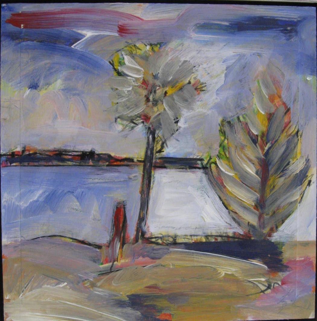 Leyh, Robert Reinhardt (1961 - ) Danmark: Landskab. Blandform på plade. Signeret.: Leyh p bagsiden 2000. 24 x 24 cm. Med svæveramme.