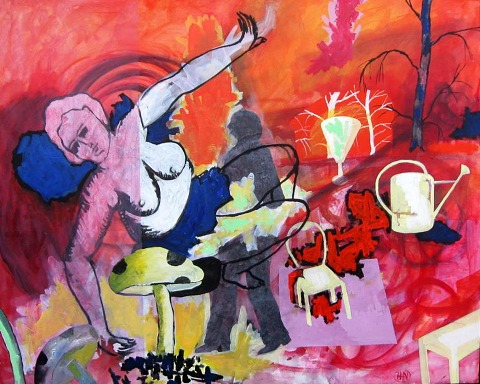 Nielsen, Hans Helge (1942- ) Denmark: Paraphrase from Max Ernst - Une semaine de Dante with fragments from my garden. Mixed media on canvas. Signed.: Monogram. Also signed on the back. 90 x 100 cm.