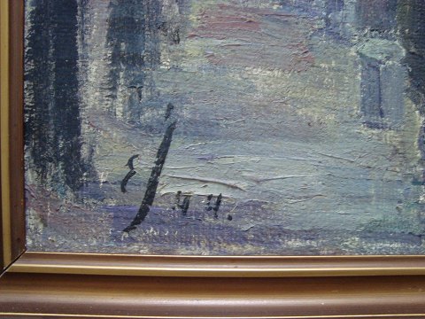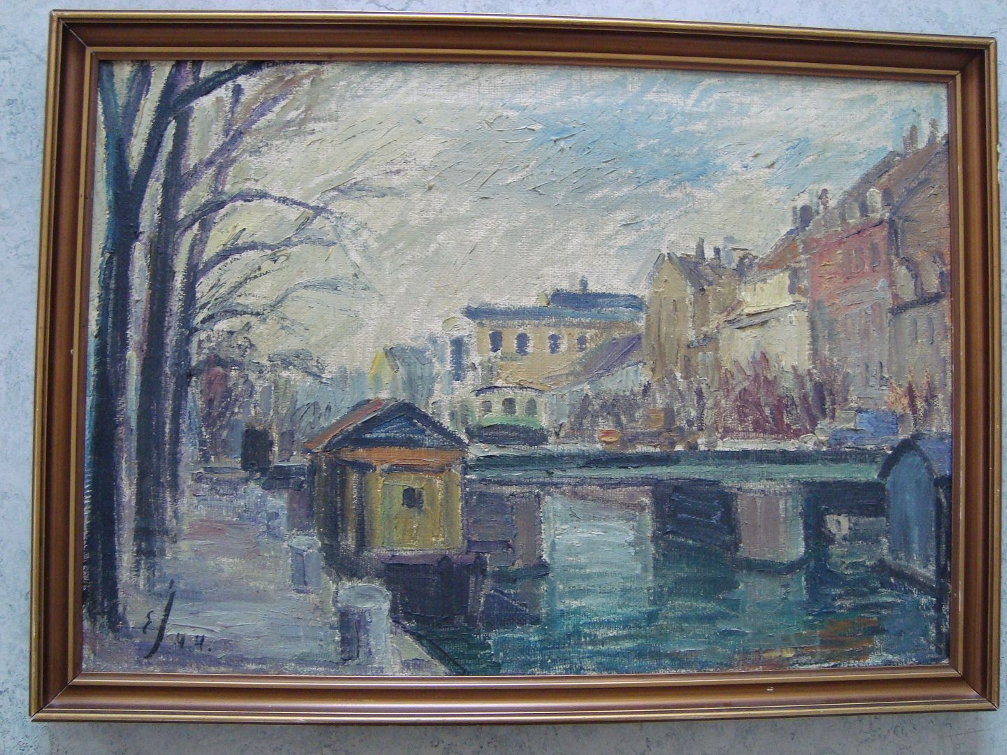 Maleri af Einer Johansen 1944 - Bymotiv med kanal og bro.