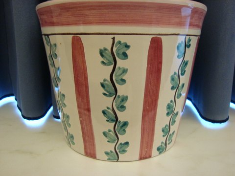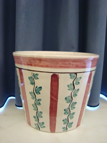 Urtepotteskjuler af glaseret lertøj med dekoration af grønne bladranker og lyserøde strib.