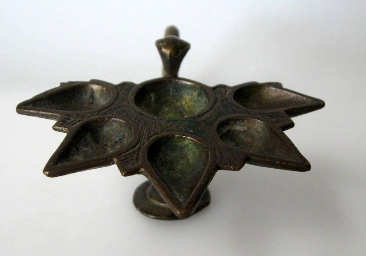Indian bronze oil lamp, 19th century. Handles shaped like a cobra snake. 5 tulip shaped holes and 1 round for wick. L .: 12.5 cm. B .: 8.5 cm. H: 4.8 cm.
