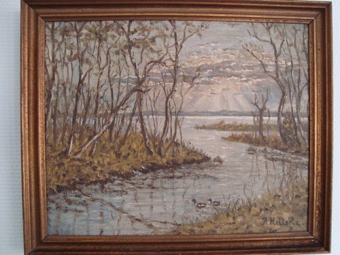 Maleri af A. Hillertz - Solen bryder igennem ved sø med ænder.