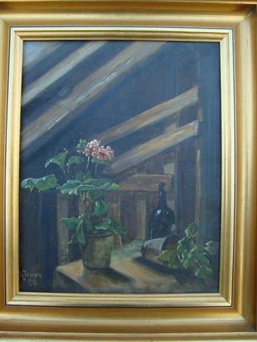 Maleri af William Jensen 1918 - Pelargonie i potte på bord.