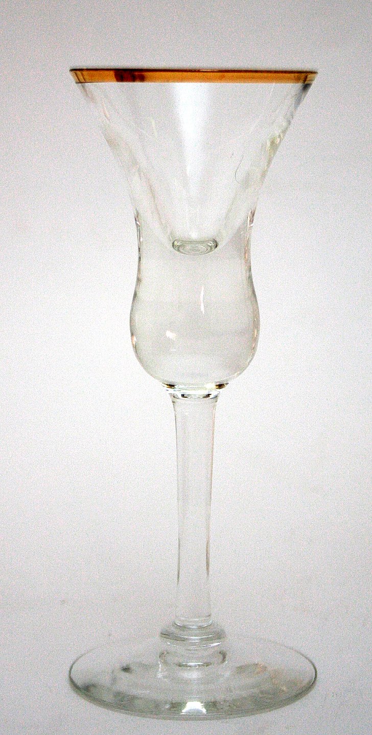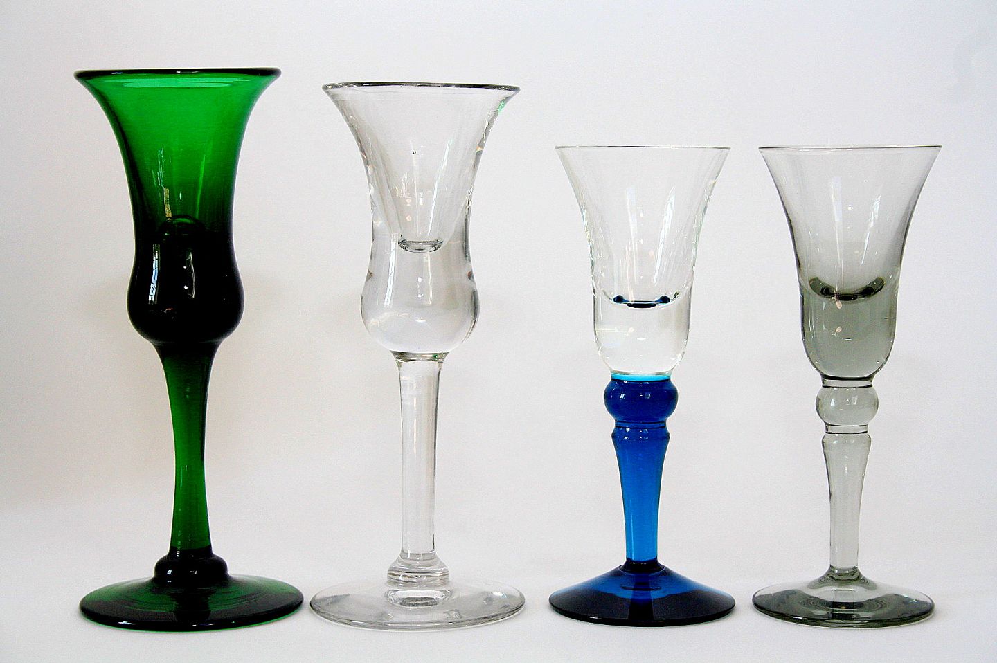 To Hollandske klokkeformet snapsglas og to med kugle på den klokkeformet kumme: