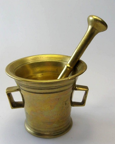 Antik morter med pistil, Danmark, 19. årh. Med hanke. H.: 9 cm. Længde pistil: 16,5 cm. Uden stempler.