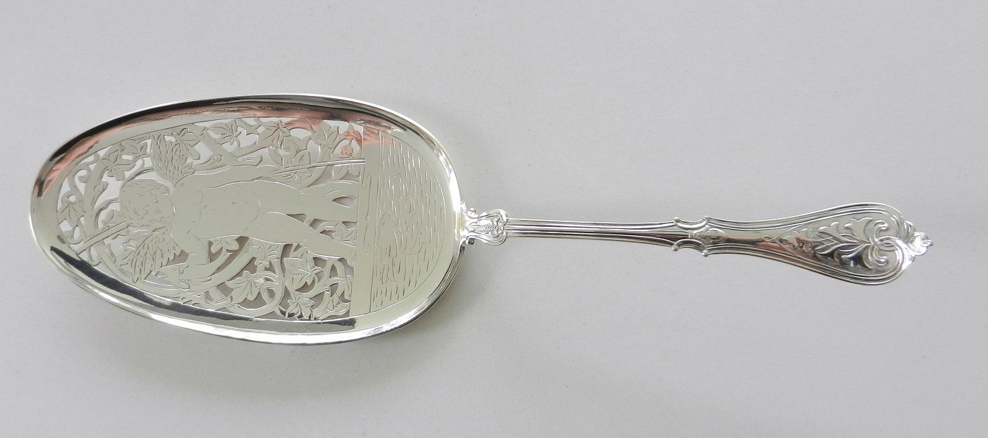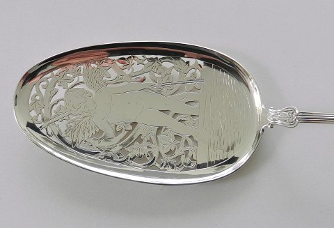 Fiske spade fra 1887 med smukt graveret mønster i form af engel med fisk.