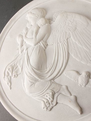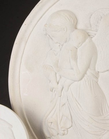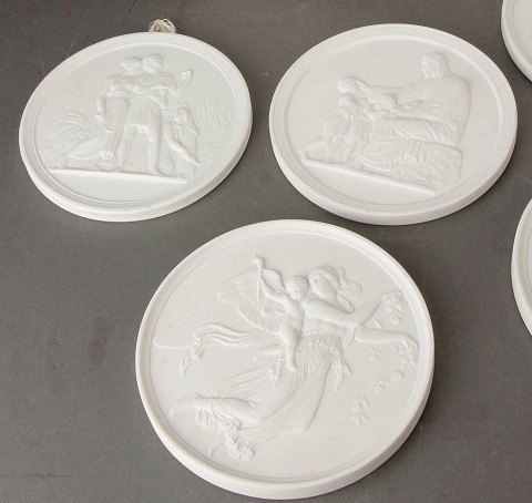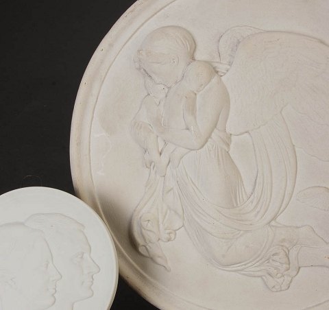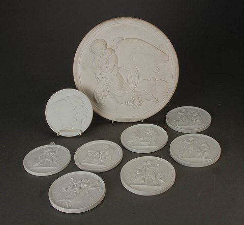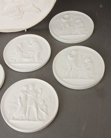 Royal Copenhagen 8 bisquit platter i relief efter Thorvaldsen, Ø ca. 14,5 cm. Platte af gips med relief, Ø 33 cm. Sent 1800-tallet.