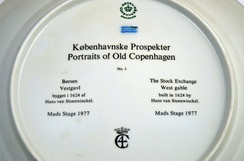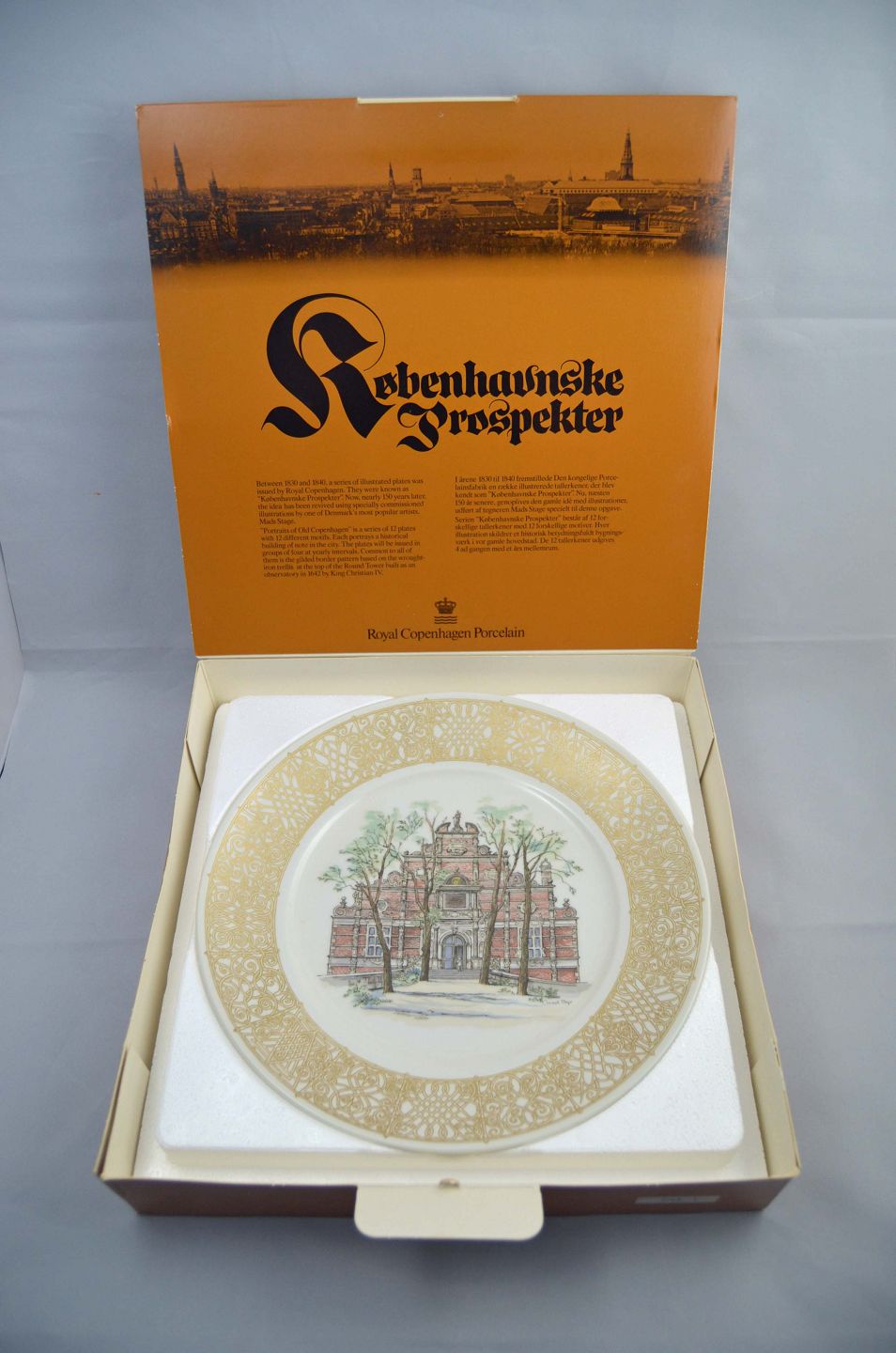 Platte fra Royal Copenhagen med motiv af Københavnsk prospekt. Serien 'Københavnske prospekter' består af 12 platter/tallerkner, som hver især viser et motiv af et betydningsfuld historisk bygningsværk beliggende i København. Motiverne er tegnet af Mads Stage i 1977.