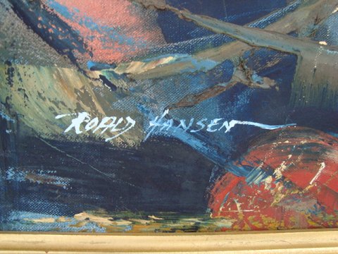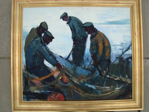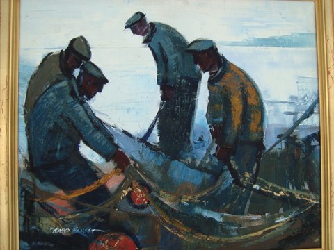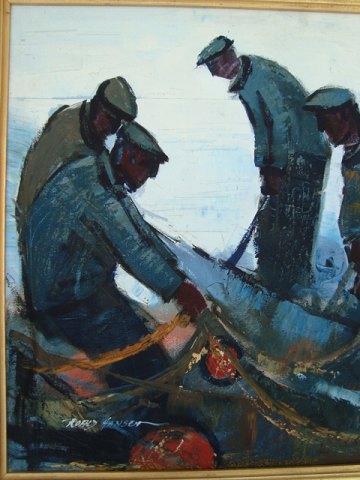 Maleri af Roald Hansen - Fiskere røgter garn.
