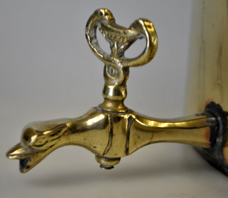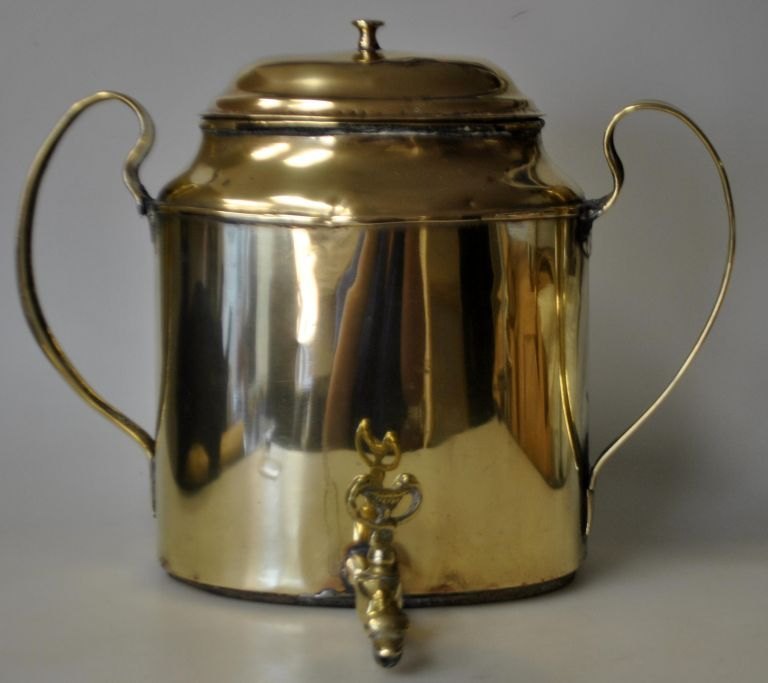 Vand maskine, empire, i messing, o. 1810 - 1820. Danmark. Glat korpus med to hanke, lågknop og hane i form af delfin. På fyrfad med løvefødder og gennembrydninger. H.: 31 cm. B.: 24 cm.