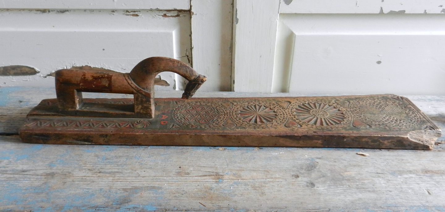 Smukt manglebræt med original bemaling, ejerinitialer MBAD, fra starten af 1800tallet, meget flot ud skåret. Håndtaget i form af hest er meget fint detaljeret.