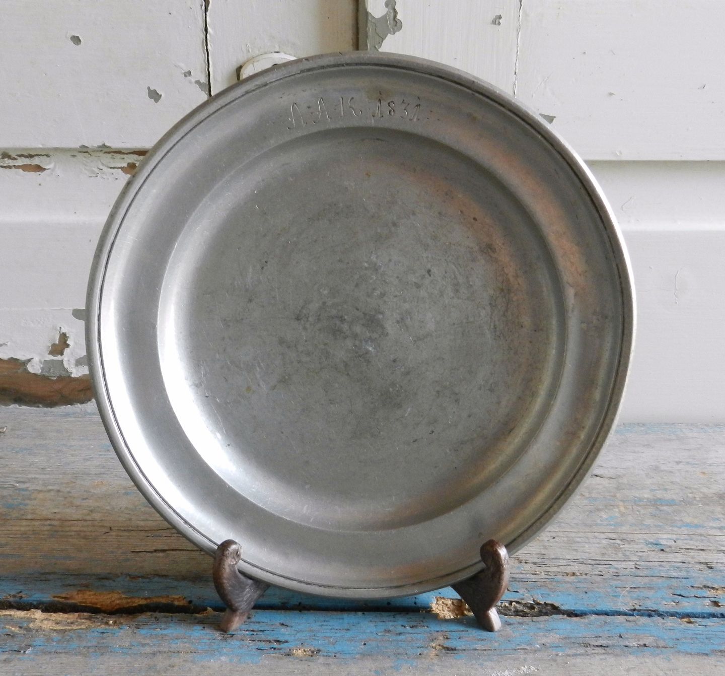 Tin tallerken stemplet 1770, indgraverede ejerinitialer AAK 1831.