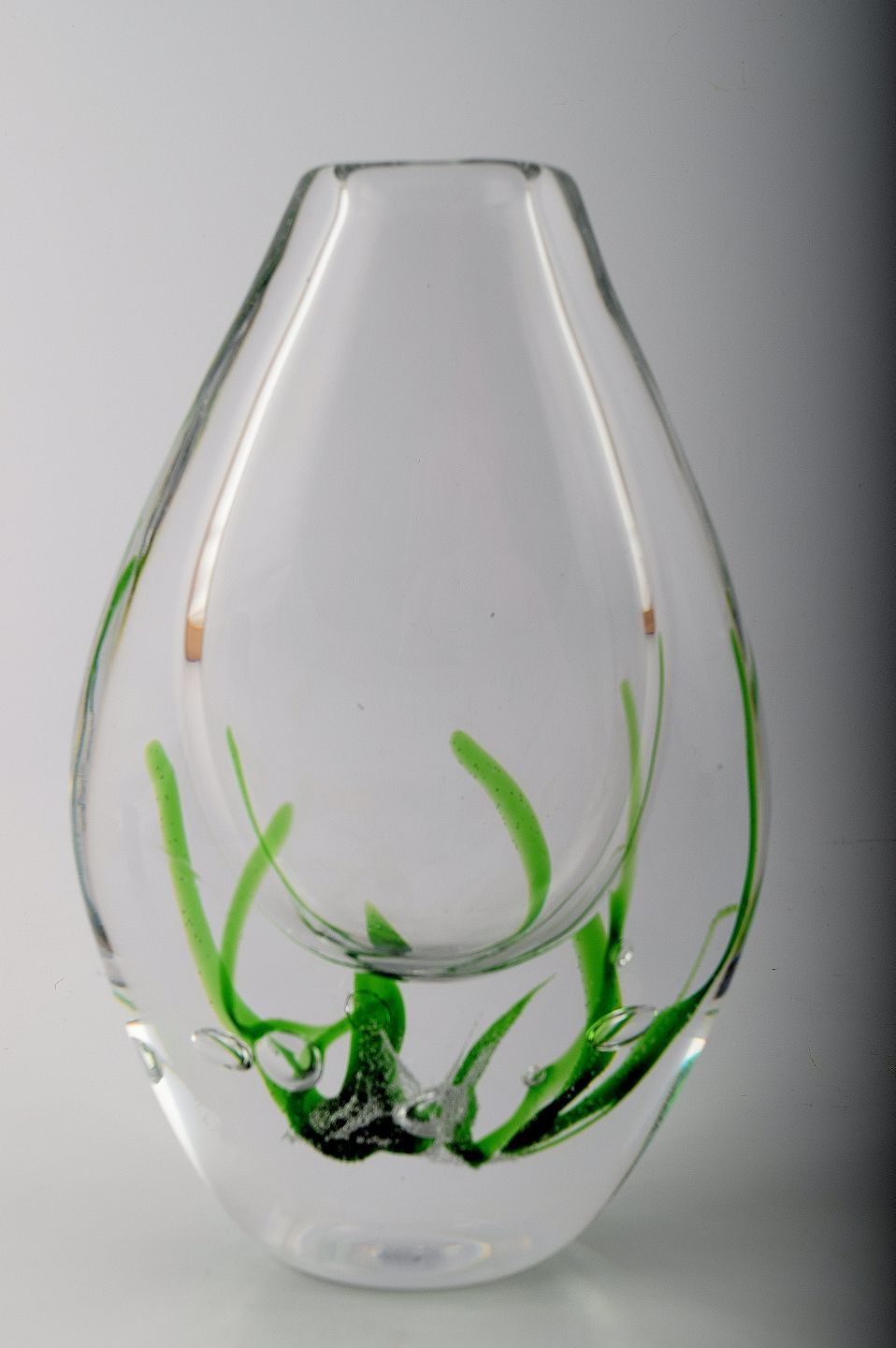 Kosta Boda glasvase af Vicke Lindstrand. Dekoreret med fisk og vandplanter. Elegant svensk design.