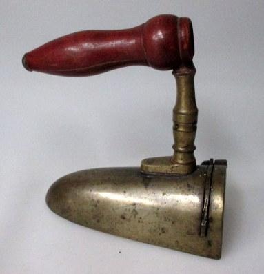 Tysk strygejern i messing, 19. årh. Med skoformet fod. Med træhåndtag og klap. L.: 13,5 cm. H.: 14 cm. Længde håndtag.: 11 cm.