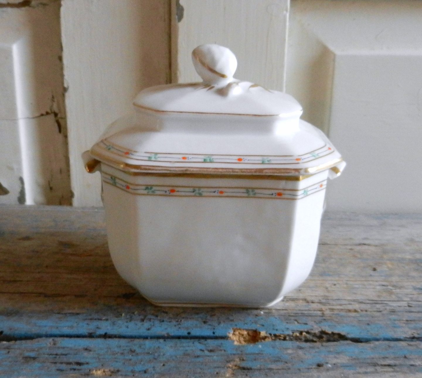 Fransk 1800tals sukker skrin, med enkel dekoration i guld, grøn og rødt.