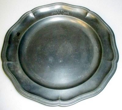 Ligeknækket rococo tintallerken, Köningsberg, 1790. På fane indgravering.: HR. Stemplet for fin tin og bymærke 1780. Dia.: 23 cm.