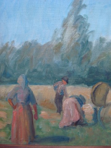 Maleri af Holger Hansen - Høstparti med arbejdende personer.